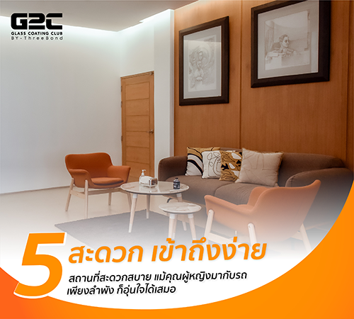 ศูนย์บริการของ G2C ถูกออกแบบให้เป็นมิตรกับทุกคน บรรยากาศสะอาด ปลอดภัย เหมาะสำหรับลูกค้าทุกกลุ่ม โดยเฉพาะคุณผู้หญิง ที่สามารถเข้ารับบริการได้อย่างสบายใจ แม้จะมาคนเดียว